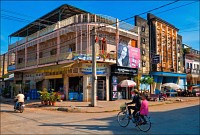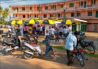 Русский "авось" - есть самый лучший метод познания окружающего пространства. Вышел за ворота, огляделся, повернул налево, до угла дошёл - ещё раз повернул налево. О, славненькая улочка. Домики такие двухэтажные, тихо, пустынно. Похожих нет, гуляй себе на здоровье. Фотик обнажил, гуляю. Тот мудрец, кто первым определил "сонный город КампОт", вложил в эту простую фразу саму суть города. Никто никуда не спешил (ещё бы - 6 утра...). Я какое-то время был единственным бодрствующим жителем, и мне это жутко нравилось. Сколько я сделал “случайных” поворотов, один трек в GPS и знает. В конце концов, незаметно обнаружил себя на Главном Круге (Central Roundabout) города. Первое, что заставило серьёзно придержать крышу - промо-акция... "Билайна"! Хренассе... Танцы, знакомая по роликам музыка, драйв, молодёжь на байках тусуется. Все кусочек далёкой России в свой мобильник заполучить хотят. :-)