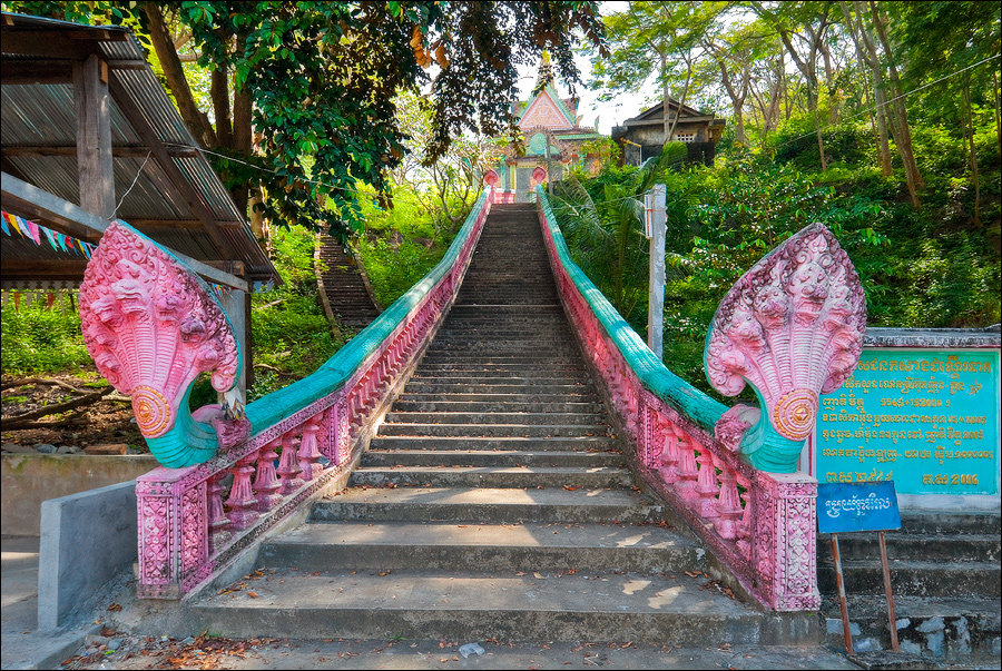 Дорога до "Чхнорка" была ещё хуже, чем до "Дракоши". Всего 4 километра от трассы по GPS, но влачились мы, если можно так выразиться, со змеиной грацией пересидевшего в айриш пабе завсегдатая. Ну, того, которому каждый следующий столб на противоположной стороне улицы ещё больший брат… С той разницей, что у нас были пальмы, а не “городское осветительное оборудование”. Этой пещеры я бы без гидов точно не локализовал. От ближайшей монастырской обители - порядка полутора километров пёхом по рисо-полевым стёжкам. Красивый глухой грот на аперитив, бетонная лестница-серпантин в небо в качестве "main course". Монахи, ступы, благовония, синие таблички с нечитабельной кхмерской вязью. Касса, в которой на пять баксов одной бумагой посмотрели так же, как на тридцатимиллионный чек в зачуханом провинциальном банке. Теперь я неправильный баранг! За "правильных" барангов водители тук-туков билеты в пещеры не покупают... Запишите на мой счёт, пожалуйста.