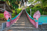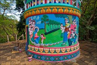 Когда под ногами обнаружились бетонные ступеньки, а по прошествии недолгого времени - английская табличка "Вход" с указателем направления движения, откуда мы только что вышли, я понял, что “пионеры” издевались над глупым барангом, как умели. Тем не менее, количество положительных эмоций росло и, отдавая две "уан доллы" (два проводника - две "уан доллы"...) - приступа амфибиотропной асфиксии я не ощутил. По вылазу у самой пещеры обнаружилась высокая сине-зелёная ступа. Рисунки на ступе были выполнены в стиле развитого соц. реализма. У нас так в детском саду МВД на стенах рисовали… Блин. Как ни мазался, как ни брызгался, пару комаров меня под землёй всё-таки в загривок "ущипнули". Ещё бы, ходит столько вкусной еды, гремит железяками, светит фонариком... Теперь остаётся уповать на матушку-статистику и летучих мышей, которые вполне могут предпочитать малярийное комарьё не-малярийному. Кстати, обещанных путеводителями гекконов и прочих мелких пресмыкающихся я в посещённых до сих пор "андеграундах" не встретил…
