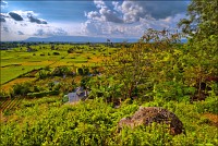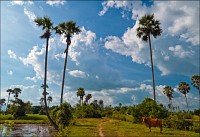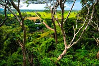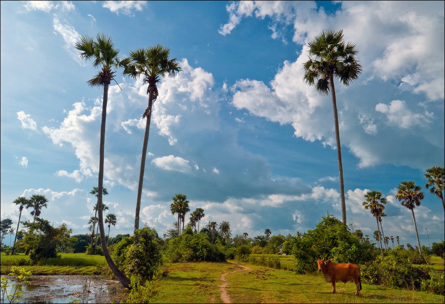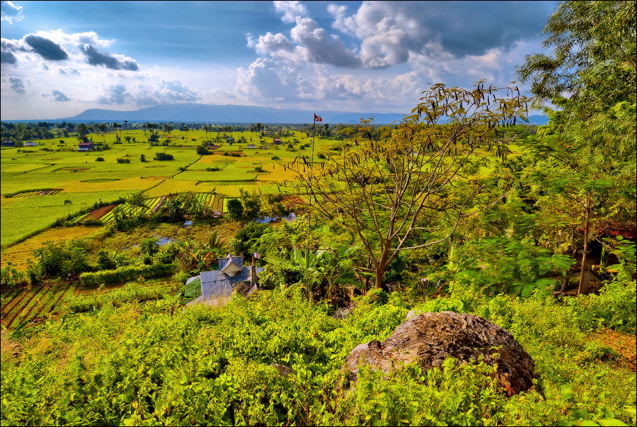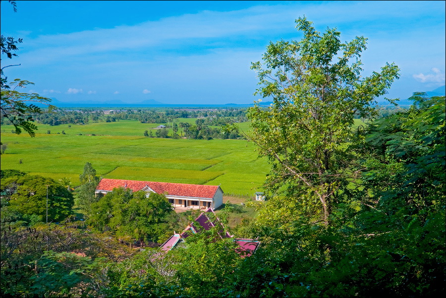 К третьей по списку пещере - Phnom Кampong Trach - мы колдобасничали уж совсем не по-детски. Такие зигзаги по канавам, только за поручни деревянные держись. Опасаясь пробить в стохастическом прыжке хлипкую крышу тук-тука (не по сединам солидному барангу с зеркальной камерой такой бихейвьер...), я "привстал в стременах" и ехал какое-то время на полусогнутых. Бездельничающим в гамаках и на кхмерских аналогах дастарханов селянам моя "джигитовка" очень нравилась. Они махали руками и кричали что-то очень оптимистическое. Интересно, оно мне всё надо? Пещерки, в общем-то, тривиальные. До стандартов "Мраморной" не дотягивают даже "с вот такенной форой". Стоило ли заводиться с продолжением спелеологического бытия? Холмо-горы, к которым мы, наконец, подстучали расхлябанной подвеской, выглядели захватывающе. Я забавный похожий рельеф видел только на фотографиях культового тайского местечка Краби. Только там "морская", а не "сухопутная" специфика. Короче. Средь голой рисовой равнины вдруг ХРЯСТЬ! - четыре наикрутейших скальных горба. Верхушки у них округлые и празднично-зелёные, а стены - без снаряжения неподъёмные.