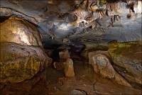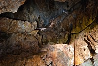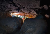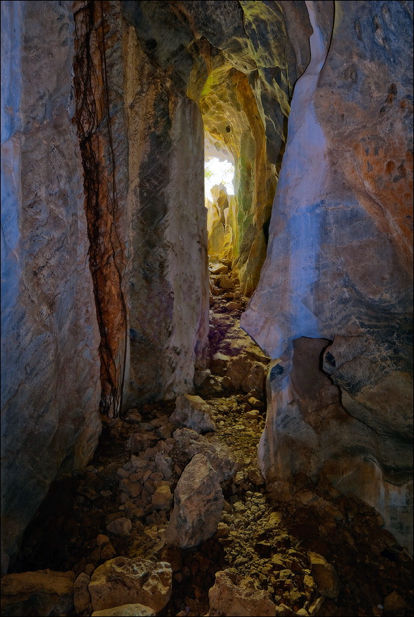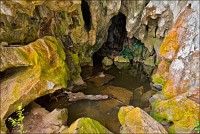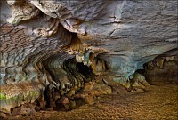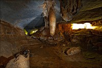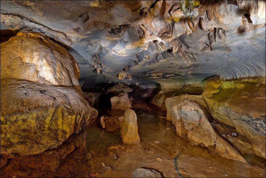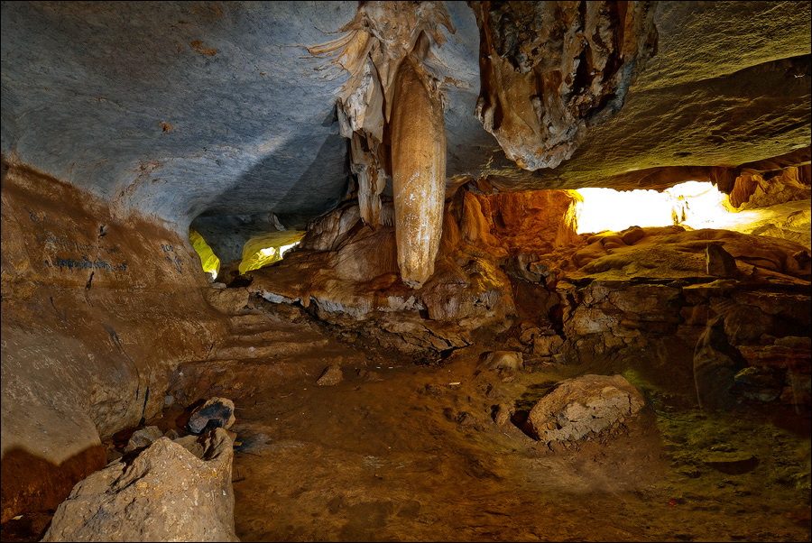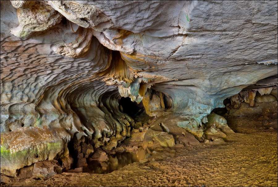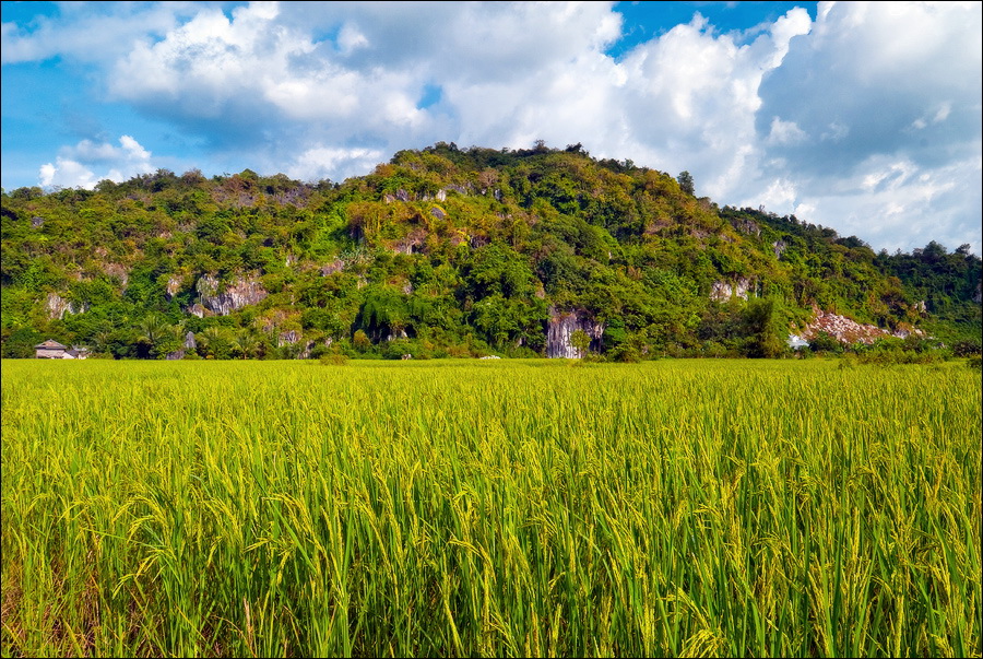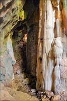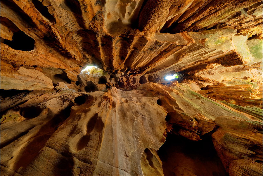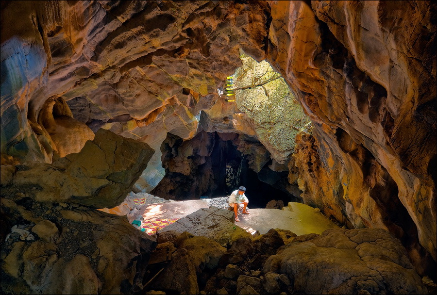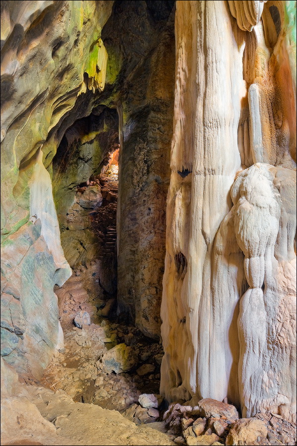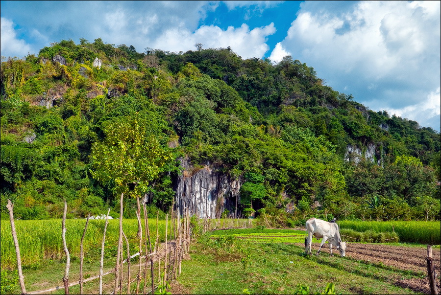 Вход во вторую пещеру был не только гуманнее выхода из первой, но намного красивее её входа. Широкий портал, интересные натёки, руки сами зачесались по штативу. Эта пещера походила на хорошо “вспенившийся” Мааздамский сыр. Небольшие залы были нанизаны как будто на невидимую нить Ариадны. Маловероятно, конечно, но меня возникло ощущение, что часть "естественных отверстий" здесь явно искусственного происхождения. Фонарик снова был почти не нужен, разве что для рассматривания особенно интересных натёчных образований. Дети совершенно заслуженно называли окружающее "Пещерой летучих мышей". Но я думаю, это была "Пещера Ста Рисовых Полей". Потому что, выдохнув, сколько смог, протиснулся куда надо (или куда было НЕ надо?) и нашёл круглую "замочную скважину", описанную в "Одинокой планете", в которую действительно просматривался Мир Рисовых Полей...