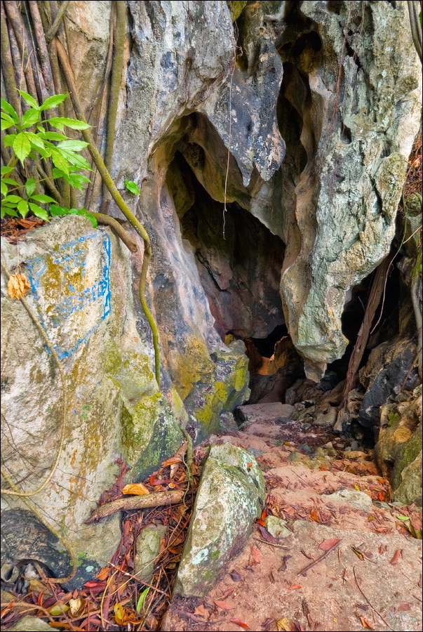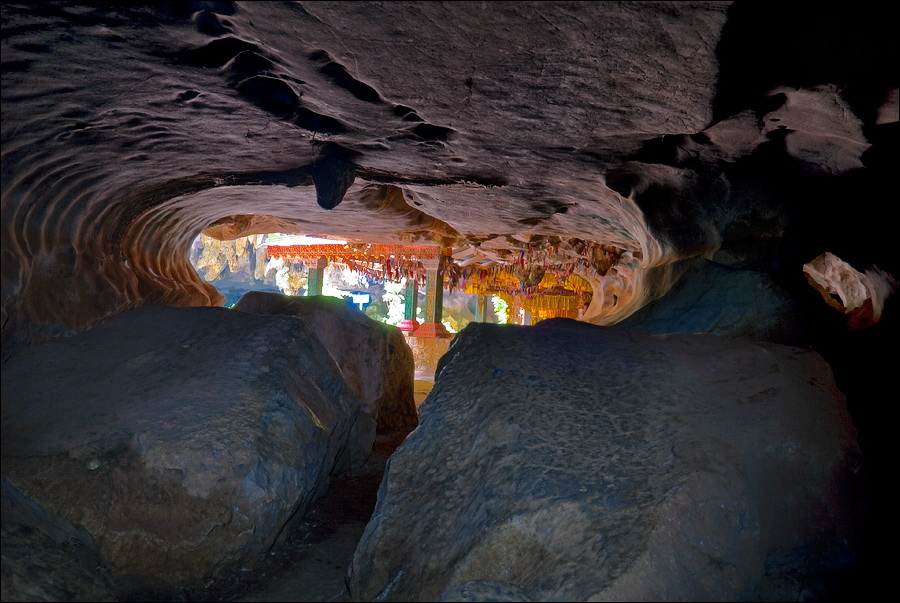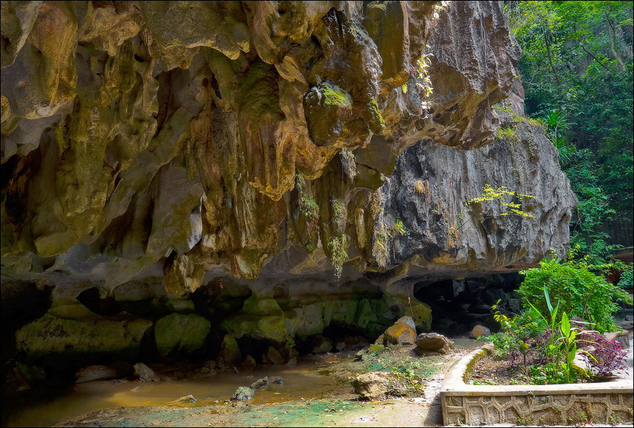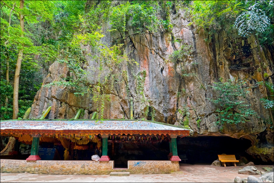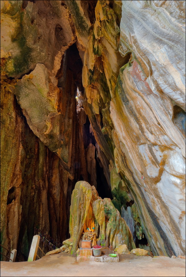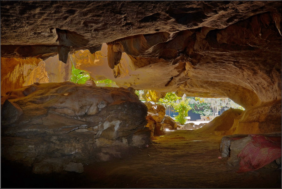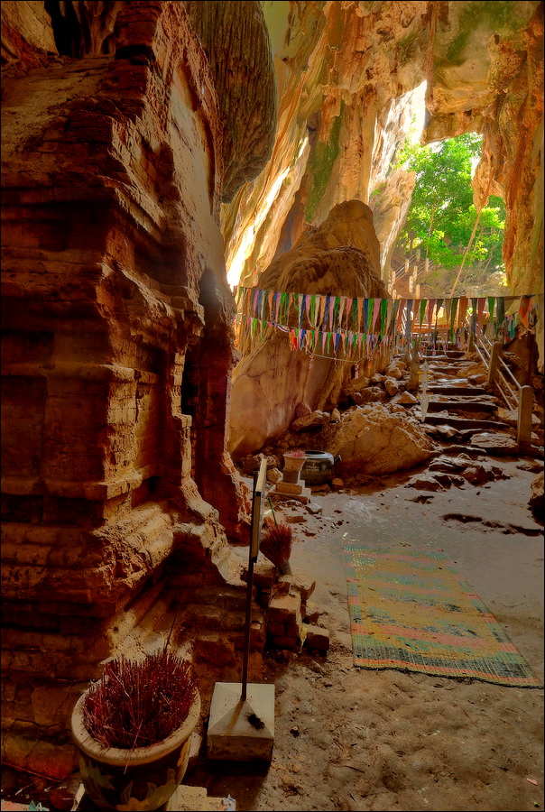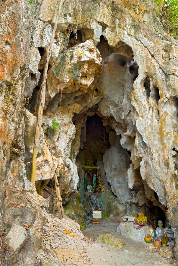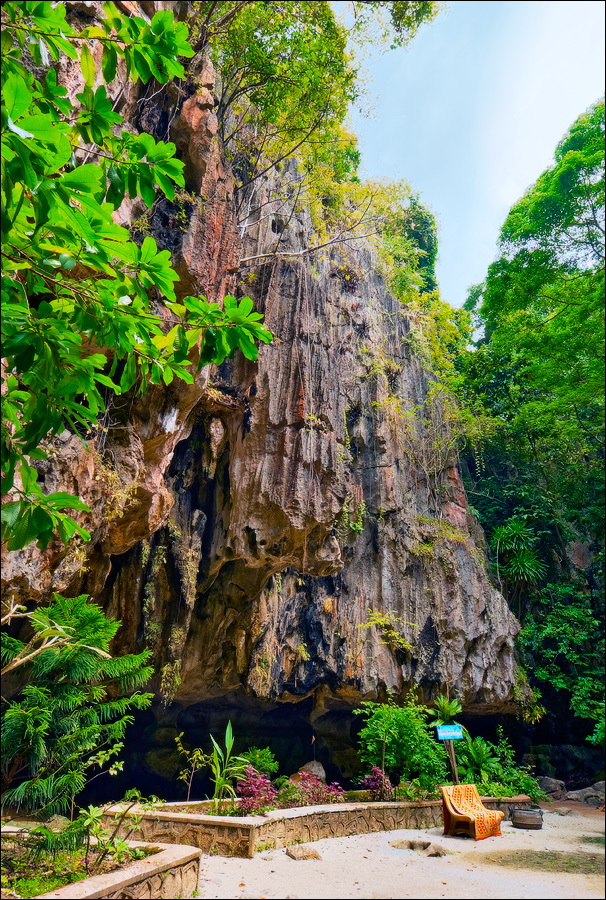 Отпааааад. Это - не есть выход! Это... это... Кто-то из верховных индуистских божеств, а может и сам Сиддхартха Гаутама - Будда раздобыл где-то по случаю офигительный перфоратор с пневматической ударной функцией. И вот, как-то рано поутру, испытывая свой новый "гаджет"... Одна из куполообразных гор, в самое чрево которой мы только что забрались, оказалась... трубой!!! Абсолютно, идеально, пугающе аккуратной трубой в синее небо! Голые скалы стен, перерастающие в натёки, снова в скалы и снова в натёки... Красота и мощь ну просто неописуемая. Высота "трубы" - метров двадцать, а может и все тридцать, кто её снизу угадает. Задираешь голову - шея болит. Стены - вертикаль, ватерпаса не приноси. Но самое интересное - плоское дно "трубы". Половина - дикие джунгли, каменные хаосы, мхи, вертикальные трещины, глубокие каверны, озерца, капающая с потолка вода, комары и летучие мыши. Вторая половина - аккуратные песчаные дорожки, клумбы-газончики, статуи Будды в блестящих шёлковых саронгах, молельные коврики ручной работы, арома-палочки сотнями в особых глиняных горшочках. Это не просто Райские Кущи. Это демо-версия Рая на Земле! Такие вот места - переворачивающие восприятие Природы как тупой стихийной силы - почти ответ на вопрос, где заканчивается просто Природа, и начинается Творец...
