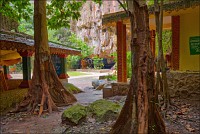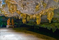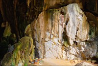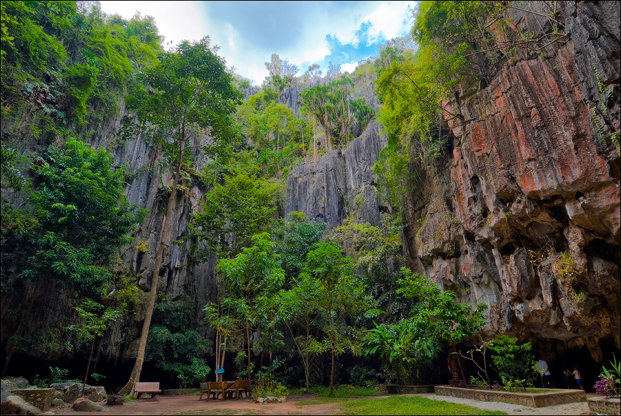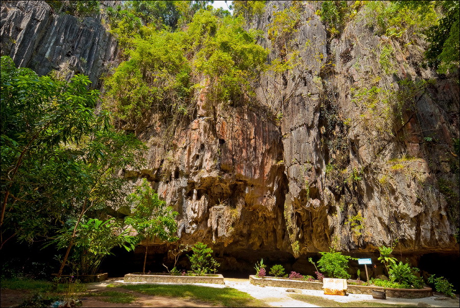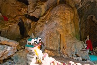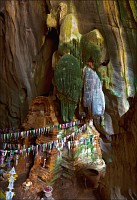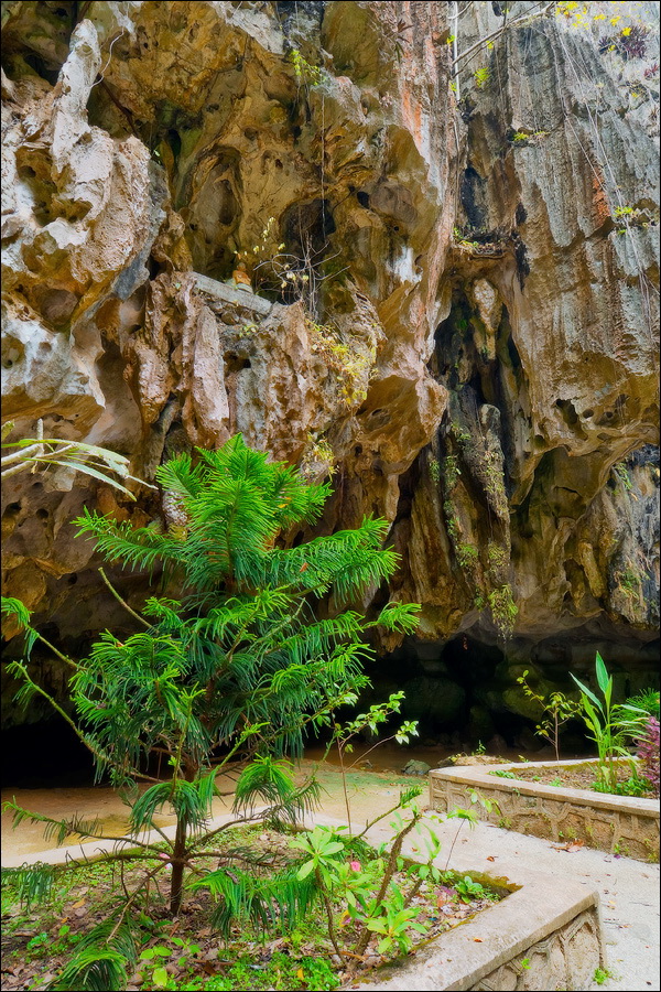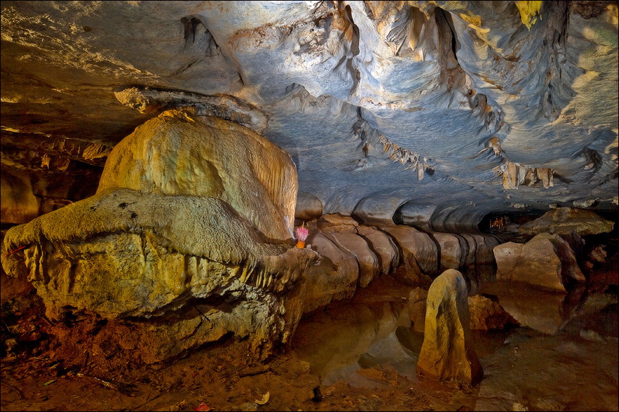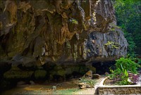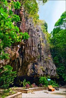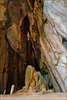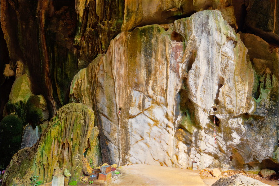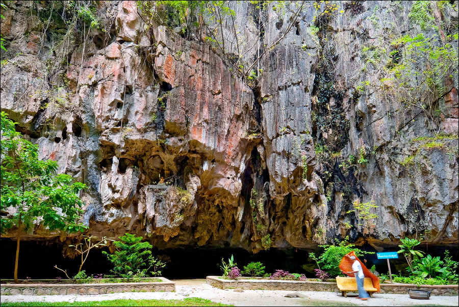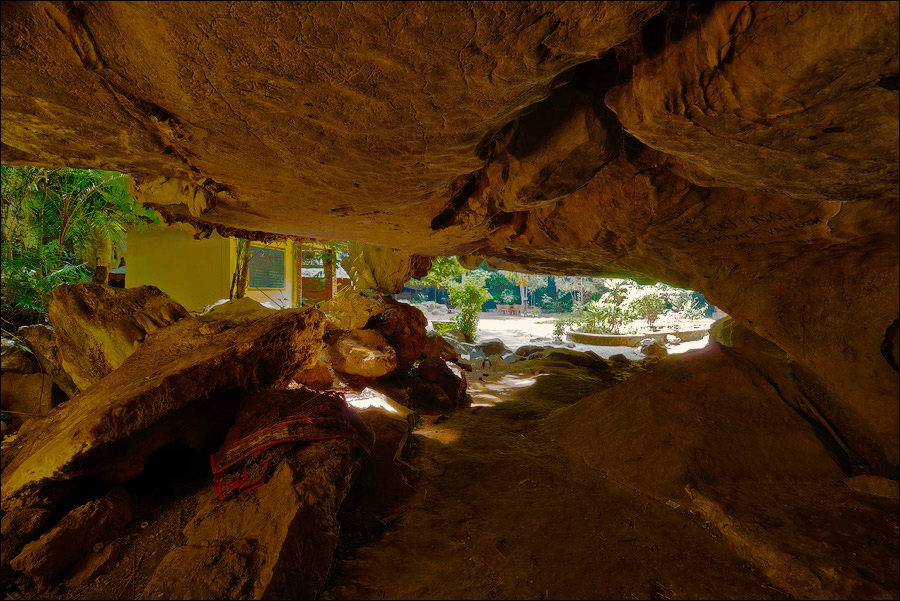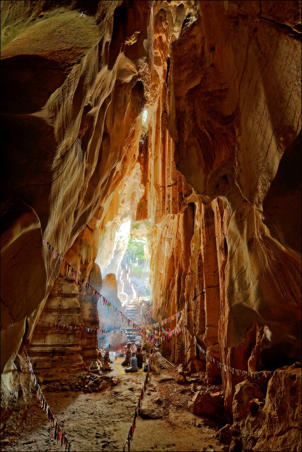 Отпааааад. Это - не есть выход! Это... это... Кто-то из верховных индуистских божеств, а может и сам Сиддхартха Гаутама - Будда раздобыл где-то по случаю офигительный перфоратор с пневматической ударной функцией. И вот, как-то рано поутру, испытывая свой новый "гаджет"... Одна из куполообразных гор, в самое чрево которой мы только что забрались, оказалась... трубой!!! Абсолютно, идеально, пугающе аккуратной трубой в синее небо! Голые скалы стен, перерастающие в натёки, снова в скалы и снова в натёки... Красота и мощь ну просто неописуемая. Высота "трубы" - метров двадцать, а может и все тридцать, кто её снизу угадает. Задираешь голову - шея болит. Стены - вертикаль, ватерпаса не приноси. Но самое интересное - плоское дно "трубы". Половина - дикие джунгли, каменные хаосы, мхи, вертикальные трещины, глубокие каверны, озерца, капающая с потолка вода, комары и летучие мыши. Вторая половина - аккуратные песчаные дорожки, клумбы-газончики, статуи Будды в блестящих шёлковых саронгах, молельные коврики ручной работы, арома-палочки сотнями в особых глиняных горшочках. Это не просто Райские Кущи. Это демо-версия Рая на Земле! Такие вот места - переворачивающие восприятие Природы как тупой стихийной силы - почти ответ на вопрос, где заканчивается просто Природа, и начинается Творец...