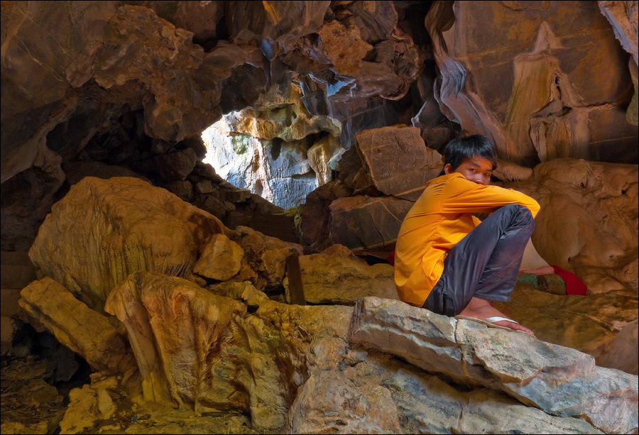 Пещера Prasat Phnom Chhnork выделялась харАктерной готичностью свода и внушительной высотой главного вестибюля. Встречал нас (кто бы только мог подумать...) Белый слон. Не сталагмит, к сожалению, а просто натёчная драпировка на правой от входа стене, но что до формы и фактуры поверхности... Я мамонта лучше этого ни за что не нарисую! Игривых человеческих глаз у него, к счастью, не оказалось. Но отнюдь не мамонт был главным в этом Прасате. За коротким крутым спуском-лесенкой, тоже справа по курсу, тулилась к стене сталагнатов небольшая кирпичная башенка, похожая на камин-переросток. Башенка Храма с самой большой буквы. Ибо, каких бы не достиг ты размеров в жизни, если сумел великолепно сохраниться аж с самого VII-го века (!!!), честь тебе и хвала, так сказать, на века. Место не просто намоленное, а буквально пропитанное духом древней религии. Тут даже камни в глубине огромного грота, где я присел надолго, чтобы попытаться слиться и постараться хоть что-то запомнить, пахнут сандалом! А если до отказа задрать голову вверх, то черепица с "башенки", не храмовой, естественно, а моей, начинает с характерным керамическим пристуком осыпаться.