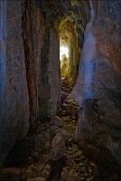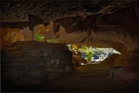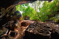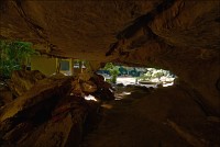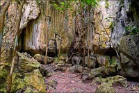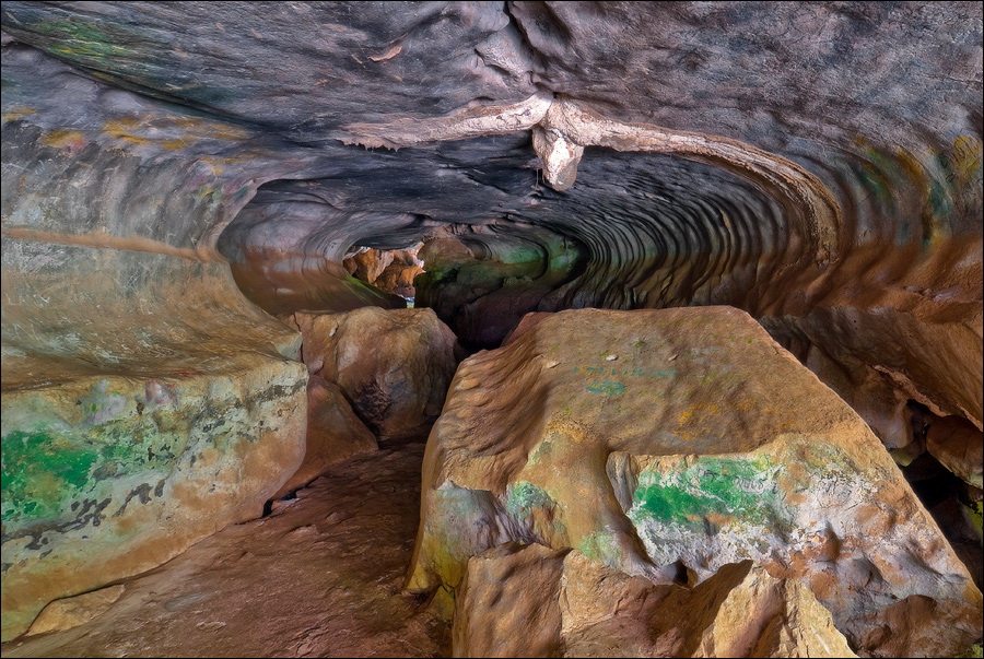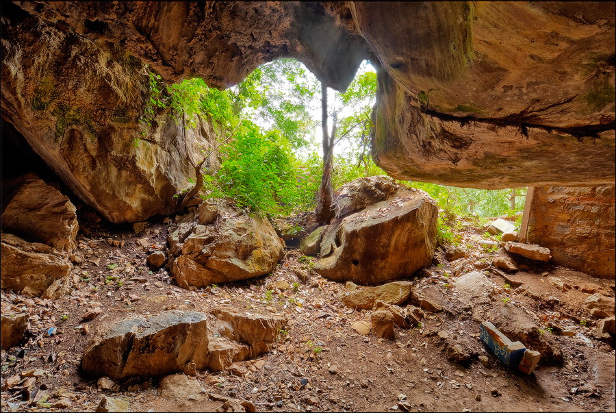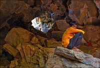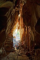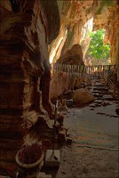 Главная обида - с той стороны, откуда мы подъехали, деревья стояли непроглядной стеной. Как широкоугольником ни раскорячивайся, не получается сфотографировать так, чтобы очарование места передать. Смотрю я на рельеф. Ну, всё, думаю, отдельно взятый баранг приплыл. Лестница наверх была... немногим лучше чем в том Та Кео. Дыханием захлебнулся, едино силой воли взгромоздился (время - прилично за полдень, "крайне солнечно", сиречь влажная душегубка). Вход Матушке-Природе удался забавным: широким и плоским, по образу и подобию камбалы. Стал пытать моих гидов, как данный "объект" именуется. Что-то они про какие-то части Dragon-а мяукают, но их английский примерно как моё "же не манж па сис жюр" - французский. Убейте, не понимаю, о внутренних или внешних признаках дракона бают. Лады, пока ставим в GPS точку DRAGON, а с прикладной анатомией чешуйчатой огнедышащей твари уже дома разбираться станем. Тёмненько так, чуть извилисто, сталактитики, сталагмитики, главное, - под ногами ровно и сухо. Мало того, ощущение, что тщательно подметено! Из-за плавного поворота является эллиптическое пятно света. Что, уже вот так вот, сразу, Dragon-у и конец?!! Обманули? Ограбили? В морду вцеплюсь? Выхожу я на свет. Тихонько прислоняюсь к ближайшей стене и медленно сползаю на землю, параллельно пытаясь нащупать штатив, потому что коленки от восторга нихрена меня не держат.