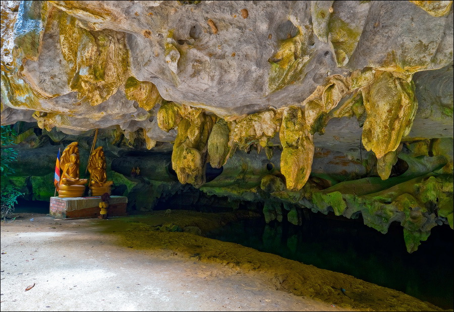 Кочевряжась по широкой железобетонной лестнице, угловатым серпантином забирающейся на гору, пухну, дохну и думаю: вот какого, скажем, Ганеши все камбоджийские пещеры заносит на самую вершину горы?!! Почему именно Ганеши? Это просто: Ганеша - пузатенький четверорукий Бог с головой слона, и пещера Rung Damrei Saa знаменита сталагмитом, напоминающим откормленного белого слона. Damrei - слон, это я ещё по Koh Ker помню. Слово "Rung" мне особенно белым почему-то не кажется, поэтому для простоты будем считать, что "белый" в этом словосочетании - это "Saa". Люблю пещеры, у которых много дыр-окошек: так живописнее и фотографирующему вызов. Но вот какого… Ганеши глупые ребятишки, что меня сопровождают, нарисовали по-европейски распахнутые человеческие глаза всем сталактитам?!! Я и без глаз вижу, что вот это - черепаха, а это - слон. Не совсем очевидно, почему у "орла" глаз прямо на животе. Наверное, у нас немного разные понятия, что такое "орёл"... Мыши летучие на грани слышимости попискивают, голубоватый свет в трещины свода просачивается, фонарик почти не нужен. Уютная, домашняя пещерка.