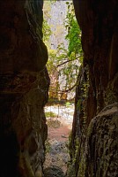 Ах, у самого выхода - долблёная каменная урна с широкой прорезью. Дотацию монахам нужно "отправить"? Ага-а-а! Вот он, первый "уан долла", которого я с самого раннего утра безнадёжно искал. Но, опять таки, - полная добровольность пожертвований. Жертвую. Выход, через который меня заставили выбираться на солнечную волю добросердечные кхмерята, оказался тем ещё “шкуродёром”. Наверное, одного "уан доллы" на всех “больных монахов” соседнего храма было мало... Пришлось снимать с живота фото-сумку, со спины - рюкзак и, передав маленьким негодяям штатив - чтобы освободить руки - протискиваться. Вымазался чуток, вырвался, когда разогнулся - опа-а-а... Махонький пятачок, вокруг непролазные "чигири". Справа, у самых колен - что-то типа собачьего лаза с торчащими отовсюду острейшими колючками. Возвращаться “уже рано”, да и неудобняк там вниз спускаться. Скрючился я, на все четыре кости пал, пополз за "гидами" (рука сама собой попыталась написать “гадами”). Теперь и колени грязные, вечерней стирки не миновать. Хорошо, ползти было недолго: шагов сорок. Всего в одном месте рубашкой за колючую лиану зацепился и, неосторожно выдираясь, мизинец в кровь ободрал.