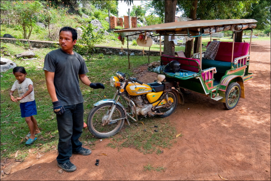 Подавившемуся центами барангу тук-тук однозначно нужен. Но вот знает ли многоуважемый мистер Соф из собственной компании “Kampot Transportation”, где тут вокруг попрятались знаменитые пещеры? Ну, такие, "биг нэчурал холз ин зе лаймстоун". Тут баранг начинает козырные распальцовки, кидая местные названия: Rung Damrey Saa... Phnom Sorsia... Phnom Chhnork... Чувак оказывается в теме. Добавляет к списку "Пещеру Ста Рисовых Полей" и "Пещеру Дракона", после чего, не слишком надолго задумываясь, просит… 20$ за день! А потом упирается на этой цифре, что водяной буйвол рогом в пальму. Кручу его и так, и этак - нифига. Прямо “но пасаран” какой-то, а не приличный кхмер. "Дистанс из биг", "роад из бэд". Короче говоря, скидок молдаванам нихт, и всё тут. Лады, говорю, чувак. Но учти, если мне не понравится то, что увижу, больше 15-и зелёных тебе не дам. Лыбится, гад. Ну нет, я так легко тебе не отдамся... По городу ещё часок погуляю, - говорю, - а ты тут жди. Я к тебе, противный, вернусь (а заодно у других тук-тукеров расценки уточню...). Ага. Щас. Этот следопыт целый час за мной из-за углов следил. Прошёл час. Подъезжает. Поехали? Уф-ф-ф... Ну, поехали…