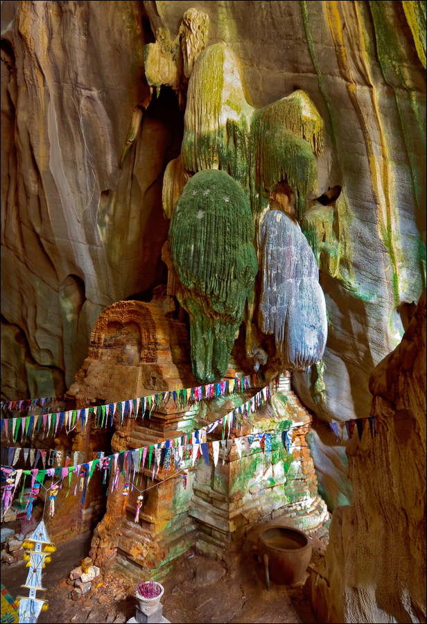 Вот вам и какой-то заштатный "Dragon"... Пока я все боковые штреки чудо пещеры изучал, хрустальную капель и мышиную возню под потолками слушал, один из монахов на коврик присел и затянул литанию. Чувствуется, выбирал, где сесть. Вроде совсем негромко поёт, но стены - как резонатор, как трубы органа ему подпевают. Сталактиты - структура объёмная, мне мои гиды пять минут назад нехитрый мотивчик на них, как на вертикальном ксилофоне, уже наиграли… Фантастика и только. Часа два я там шарился. Тайную молельню с ковриками и сосудом для арома-палочек, куда узкая лесенка вела, в узком камине-трещине нашёл; по толстым лианам повыше на стену забраться попробовал; длинный боковой лаз с очень интересными зелёными натёками посетил. Чуть тапочки там не потерял, пока ноги из грязищи выше щиколотки по одной “вычмокивал”. И еще смело два часа шариться мог, но тут притащился неугомонный мистер Соф. Завязывай с фототворчеством, говорит. Время к трём, а нам ещё до Пхном Чхнорка (Phnom Chhnork) спицы ломать.