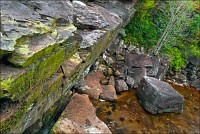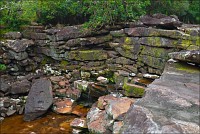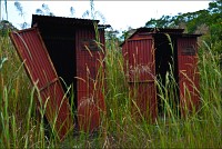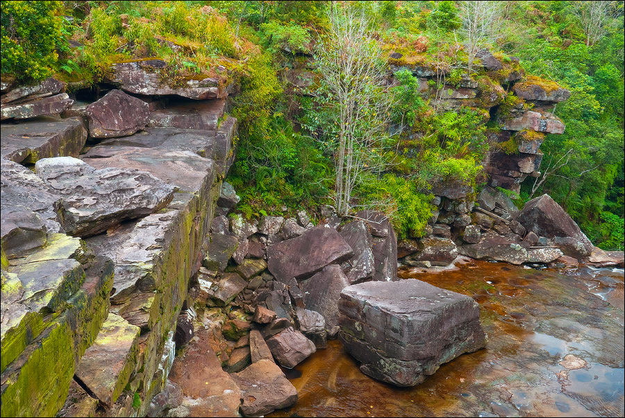 Жизнь совершенно наладилась. А там и свежие решения потекли. Тропу к водопаду и мост из переброшенных через неглубокий овражек стволов, ещё немножко поиграв в Индиану Джонса, я нашёл за хижинами-навесами с лавочками. Туалеты общественные из крашеной гофрированной жести тоже нашёл (Сначала пронзительного скрипа, почти крика, ржавых петель на ветру испугался, потом нашёл…) Когда совсем один, да в незнакомой стране, да ещё загадючился хрен-те куда, шарахаешься от чего надо и не надо. "Водопад" тоже нашёл: минутах в пяти ходьбы от хижин. В кавычках - потому что пересох их величество Попоквиль напрочь. То есть там, внизу, под 17-метровой слоистой стеной, что-то такое "жугчит", но никак не громче, чем когда Феликс Эдмундович мочился на носок ботинка Владимира Ильича в хорошо известном анекдоте. Так подобрался к самому срезу, сяк подобрался, даже вниз, на брюшко прилёгши, свесился - разумного пути к нижней ступени (тоже метров 15…) водопада не нашёл. Никто не знает, где я, скалолазить по лианам да кулуарам не решился. Был? Был. “Водопад” видел? Видел! Такую двухъярусную стену ни с чем не спутаешь. Да и место очень похоже на описанное в "Одинокой Планете".