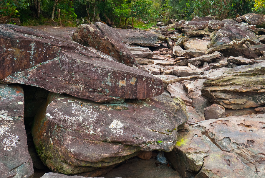 Засмотрелся я на собак, вшнякался в жидкую рыжую грязищщу повыше щиколоток. Правый тапочек завяз намертво, на левой ноге прыгаю, а тут ещё и собаки эти... Пришлось отцеплять от рюкзака штатив и показывать, кто здесь самый главный в стае баранг. Отстали. Штаны вроде целы, икры - тоже. Тапочек ножкой штатива извлёк, о камни и траву кое-как его от “суглинков” ободрал. Не эстетично и носки красной грязью хлюпают, но кому-какое дело? Вот такой, свинский странник нарисовался. Через реку с порушенным в хлам бетонным мостиком я, осторожненько балансируя, переправился по каменному хаосу чуть ниже по течению. Мог бы и вброд - реки той максимум по колено - но ведь заразы всякой в пресной воде не счесть... Поднялся на куполообразный холм, вписал по указаниям дороги пару хитрых пируэтов, вляпался в широкую полосу белого песка. Припорошил рыжую грязь на обуви песочком, теперь такой типа аккуратный. Только песок с меня на поворотах сыпется. Сейчас бы, хорошо бы, как-нибудь этот двухуровневый "Попоквиль Фолз" (Popokvil Falls) локализовать. На карте в ЖПС его нет. В "Одинокой Планете" нарисовано неоднозначно, а подписано - паркинг рядом быть должен. У меня вместо паркинга - развилка. Влево дорога песчаная, красивая. Огромная каменная стрела на постаменте именно туда нацелена. И таблички аж целых три. Две кхмерскими “совокупляющимися червячками", одна, слава Богу, английская: "Здесь ночевать запрещено".