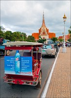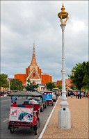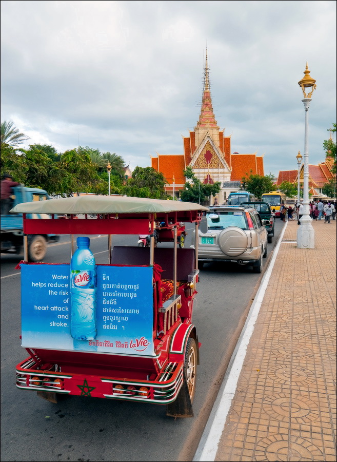 Дважды нас тормозила полиция. Дважды пассажиры скидывались по 10000 риэлей (2.5$, без квитанций ессесссна...), но ко мне по вопросу "уан доллы" не обращались. Иногда удобно быть ни разу не грамотным барангом. Пном-Пень так и остался многолюдным, шумным, грязным, тесным и бензино-вонючим городишкой. Решение переночевать тут, было, скорее, продиктовано необходимостью поставить жирную галочку "побывал в Столице страны", чем реальным желанием податься во все тяжкие прикладного пном-пеньства. Таксист выгрузил нас на каких-то глухих задворках, сразу навалились мотобайкеры и тук-тукеры. Я понимаю, ты денег хочешь слупить по-быстрому, но куды, куды мне с 90-литровой рюкзачиной на твою чахлую мотобайку?!! У неё ж не только колёса, но и рессоры полопаются, как воздушные шарики! С ценой тоже пободаться пришлось. Упёрлись - 5 баксов и ни риэля меньше. Люблю уверенных в себе. Но хто ж вам столько за 3-4 километра езды даст? Общались некоторое время, сошлись на 3-х, и то, по-моему, меня развели, как баранга. Тут, как и везде, или время, или деньги. Денег у меня немного, но времени и того меньше…