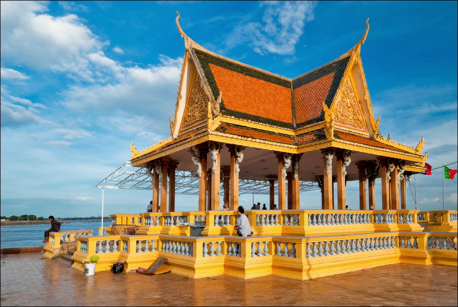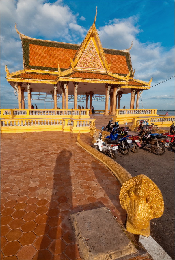 И всё-таки, знать бы заранее, насколько никакусей окажется Пном-Пень, я бы смог выкроить сегодняшний денёк, чтобы прикоснуться к многоруким Авалокитешварам отдаленного храма Bantei Chhmarr... Это, по-моему, были именно те статуи, которых так не хватало для целостности восприятия давно ушедшего мира... (Ау, Саныч, "у человека должно быть будущее", да?) К Королевской Резиденции я подобрался с самого дальнего от входа угла, пришлось обходить два квартала забора, а при попытке проникновения внутрь произошёл упомянутый вскользь выше конфликт с охранником. Это, кстати говоря, было первой и единственной грубостью со стороны местного населения, которую мне удалось “огрести” за все две недели пребывания в стране. Да подавитесь вы по самые гланды Королевским Дворцом! Да передохнут от болотной лихорадки одетые в строгие костюмы “сторожевые псы”, Ваше Величество! “Домой” я возвращался по на удивление пустынной для предзакатного времени Набережной Sisowath. Это было, пожалуй, самое чистое и ухоженное место Пном-Пеня. Теперь понятно, почему продвинутые баранги рекомендуют отели “Indochina”, “Bouganviller” и “Sunshine”…