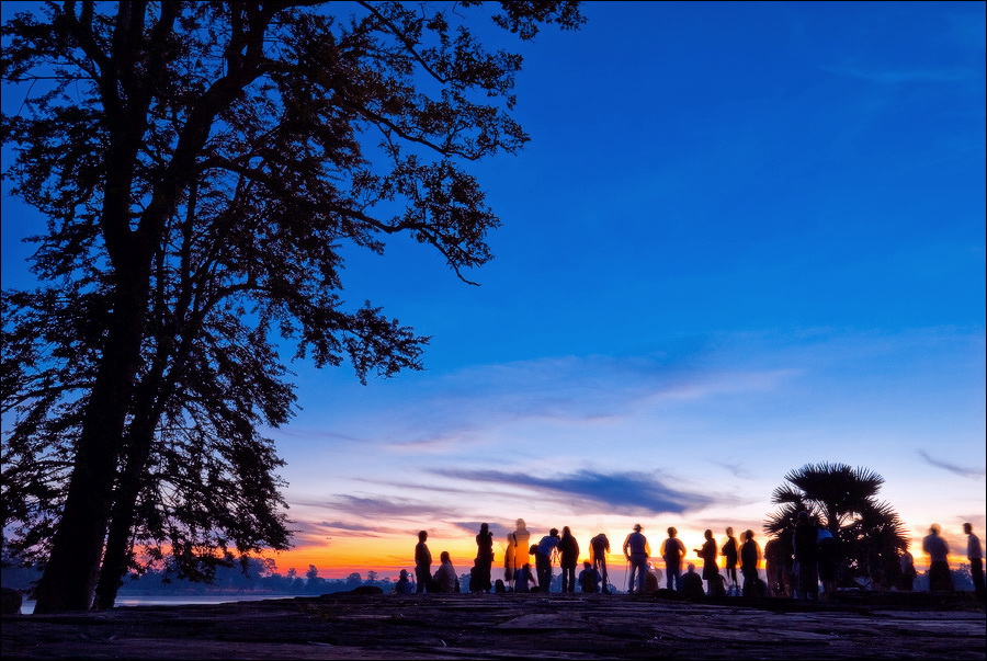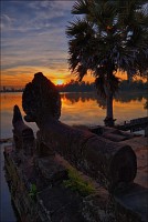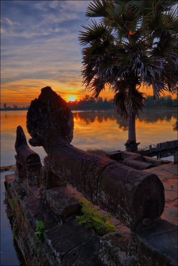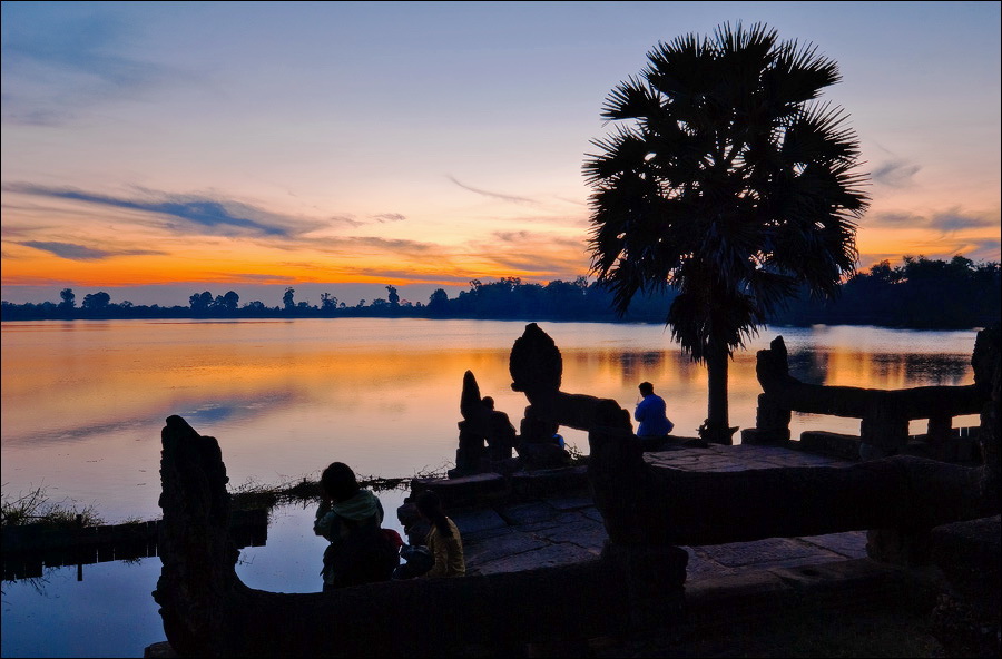 До Срас Сранга путь неблизкий. Я успел попробовать расслабиться, и даже перестал труситься как цуцик. Народа человек двадцать. Это привычно. "Уан доллов" примерно столько же. Это тоже привычно. А вот знание английского у девчушки, настойчиво пытающейся напоить меня горячим кофе, выше среднего. Кроме стандартного "вер а ю фром" всплывает "нейм оф зе капитол" и даже сколько у меня "чилдрен"-ов. "Капитол" моей страны "Уан Доллы", говорю, называется "Шизино", стараясь произнести это в тональности “Мы - пацаки с планеты Земля, номер 13 в Тентуре”. Смеётся, уж не знамо чему. Перехожу дренажную канаву по мостику из обтёсанных пальмовых стволов, взгромождаюсь на смотровую площадку Срас Сранга. Прямоугольник рукотворного озера плавно убывает в перспективу, заканчиваясь чёрной полосой джунглей, над которыми торчат весело встрепанные веерные пальмы. Небо синее-синее, до рассвета минут пятнадцать. Самое время силуэты барангов поснимать, скрашивая фотосессию дискуссией о политике ценообразования и системе скидок на путеводители по Ангкору с двумя другими "уан доллами" лет тринадцати.