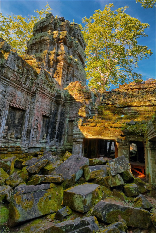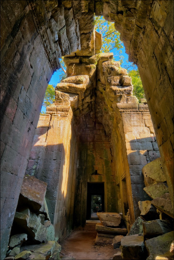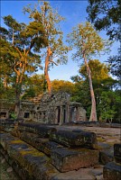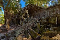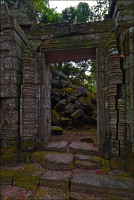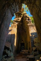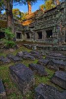 Улучшив момент, когда гид уводит первую встреченную за две недели пару итальянцев куда-то вглубь бескрайнего комплекса, корябаюсь под красный значок "Danger!". Царство мхов, ящериц, просевших в себя галерей, рухнувших колонн и неустойчивых плит. Ничего интересного: то же самое, но помноженное втрое, без никаких запрещающих табличек доступно в Preah Khan-е и Beung Mealea. Возвращаюсь, ищу новые ракурсы мега-дерева. Подтягиваются русские. Много, человек пятнадцать. Шумные, наглые. Бабьё в таких шортиках, что едва прикрывают "сервиз", потрясает фундаментальным целюлитом в преодолении высоких ступеней, взахлёб курит, многоэтажно матерясь от поросячьего восторга. Юная гидесса (по специфическому акценту - жительница "краснозвёздной столицы"...), выглядит на “бескрайнем” фоне соотечественниц принявшей обет пожизненного голодания эльфийкой. Мужики тоже матерятся. Действительно, - когда ещё Лужков издаст постановление о разрешении материться в Кремле или, там, Третьяковской галерее…