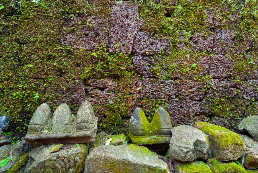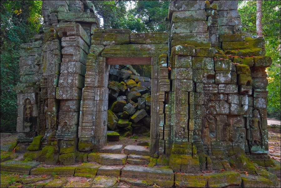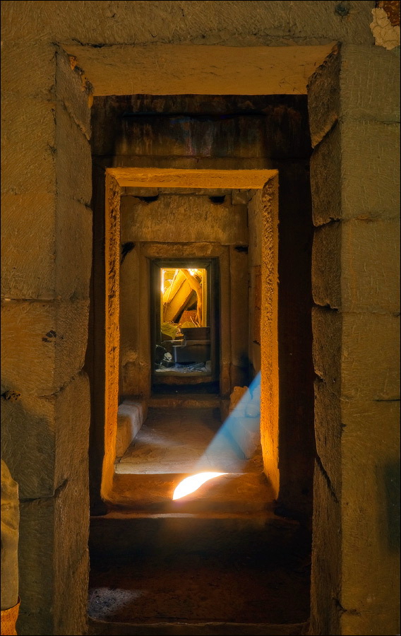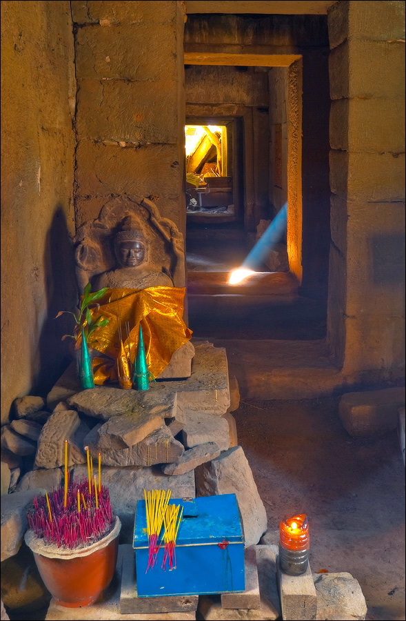 Из зеленоватой темноты коридора материализуется загорелая дочерна бабуца в конической соломенной шляпе. Подмышкой - скамеечка с деревянными ножками высотой сантиметров 10. На плече - коромысло. На одной “чаше” импровизированных "весов" - это железный тазик - рдеющие багрянцем угли, на которых жарится мясо. В другой “чаше” - плетёной корзине - мелконарубленная зелень, рисовая лапша и целый эскадрон соусов. Я что-то думал, что вход таким “питалищам“ на территорию “культовых объектов” воспрещён… Коридоры, переходы, пузатые Будды в тогах из золотых шёлков, курящие им фимиам палочки цвета шафрана на нежно-розовых ножках. Возжигаю еще одну “хворостину”, сжимаю её в сложенных лодочкой ладонях, трижды кланяюсь, загадав желание, добавляю в обойму. Свет льётся из квадратной дыры в крыше. Под ногами островок истоптанной травы. В тупиковом проходе - знакомые по Koh Ker квадратное основание с длинным узким водотоком на север. Интересно, куда подевались лингамы, вздыбившиеся в пылу неуёмной страсти по йони*.
