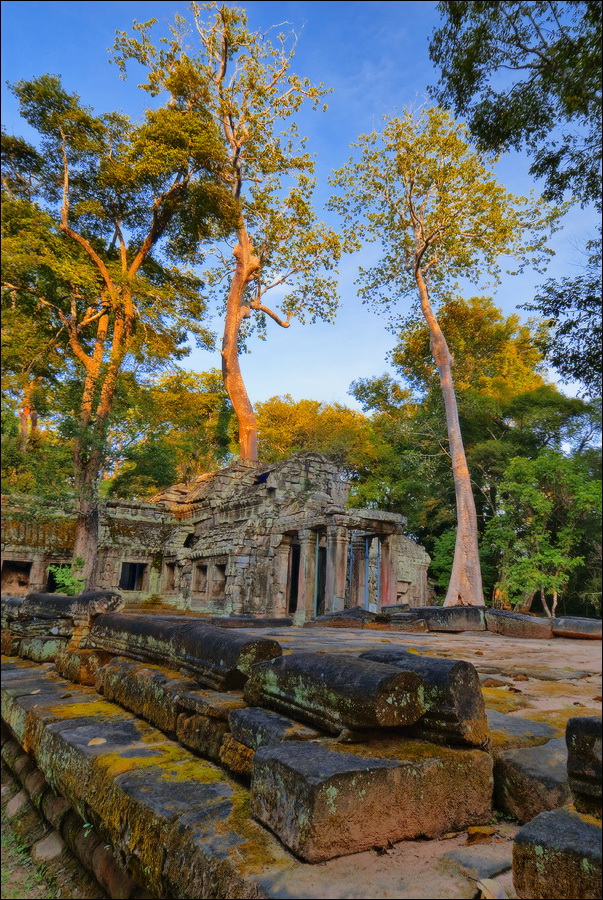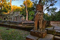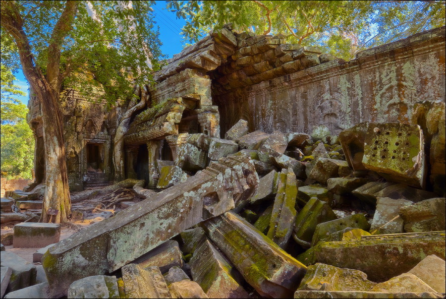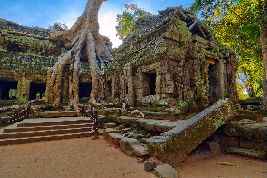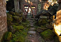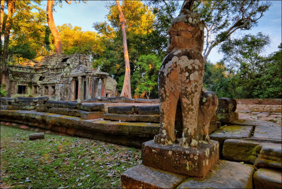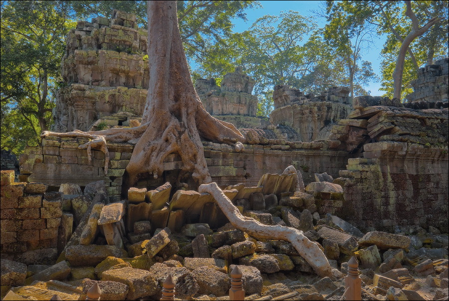 Прости меня Срас Сранг, но я снова не буду ждать солнца. Больно уж легки на подъём вездесущие дети Страны Восходящего Солнца… Обещание вернуться, бесшумный всплеск озера, юркой серебристой рыбкой ускользающая на дно монетка с орлом, зажавшим в клюве крест. Тук-тук, асфальт, грунтовка, заваленные колючими ветками развалины ворот. Широкая аллея жёлтого песка стрелой убегает в джунгли. Мне туда. Мимо зеленых луж и кустов, толстых лиан и кустов, сложных пирамид кирпичей, бывших когда-то храмами. Мимо стоящих навытяжку трио "уан доллов", выводящих настолько хитрый мотив тоненькими ангельскими голосками, что своё “заветное” они получают в трёх экземплярах. Мощёная дорога, осыпающаяся мшелыми глыбами балюстрада. Снова львы, снова Наги, подпирающие самое небо мега-деревья и широкая, но одноэтажная тяжесть застрявшего во времени Та Прохма. Есть только я, цикады и птицы.