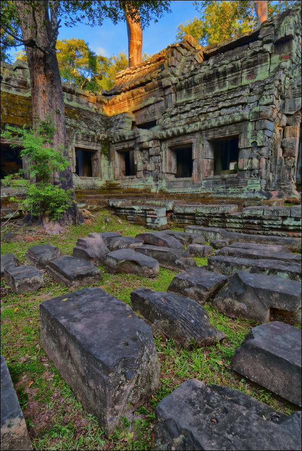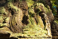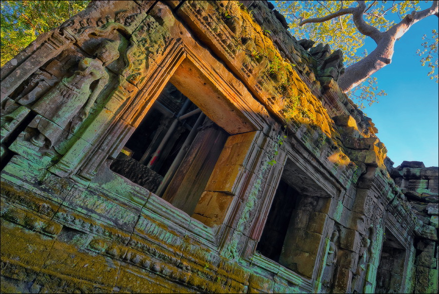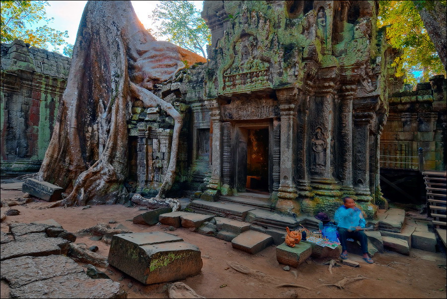 Ласкаю восхищённым взглядом дерево-гигант, навалившееся-и-вцепившееся в раму окна, как андский кондор в тушу жирного муфлона. Нарочито медленно огибаю тринити красновато-полынных готических башен (лишайник по кирпичу - это так красиво...), ближний левый угол центральной из которых уже 800 лет хранит барельеф крохотного стегозавра. Прощаюсь с апсарами, крепко сжавшими ладонями бёдра и готовыми пуститься в танец Божественного Вожделения раса-лилу. Повторно прохожу рассыпавшейся ребристым экзотическим веером колоннадой несуществующего коридора. До опасного хруста в позвоночнике задираю голову, стараясь запомнить до мельчайших подробностей зелёный купол байонов (напоминаю, это не только название храма, но также вид деревьев), терзающих внешнюю стену комплекса. Мост-переход через окружающий Ta Prohm прямоугольный ров отдаёт меня в руки торговца вьетнамскими варганами. Вытягиваю мой собственный бамбуковый “дан мои” из центральной колонны штатива - он теперь всегда со мной - и демонстрирую возросшее за полторы недели мастерство. "Игра в четыре руки" кхмера и баранга живо заинтересовывает японскую делегацию, идёт бойкая торговля варганами и я под шумок исчезаю.