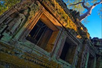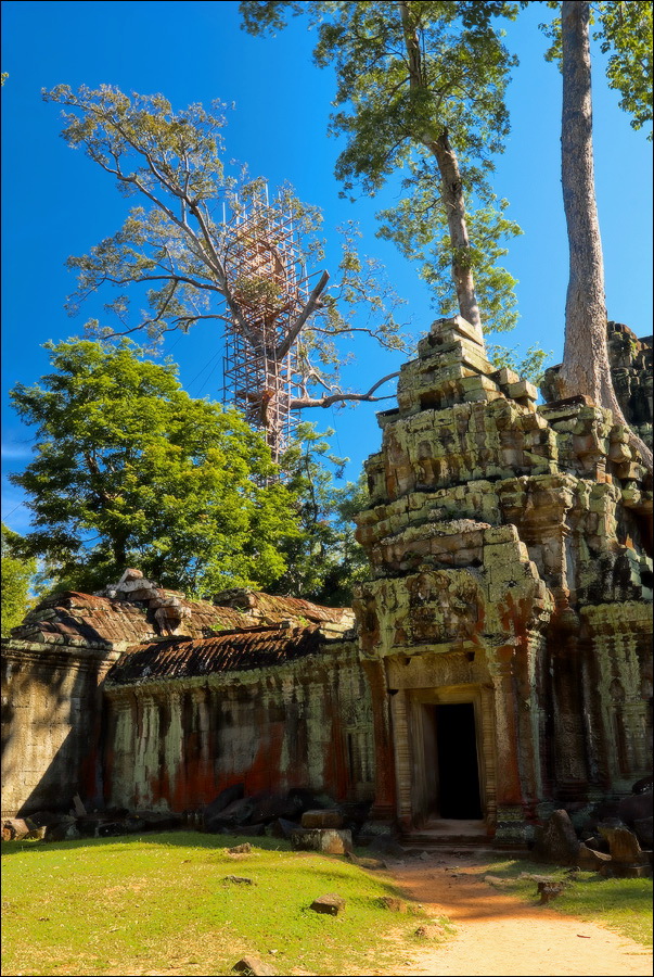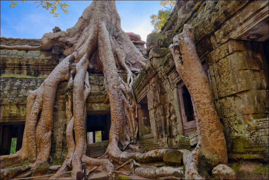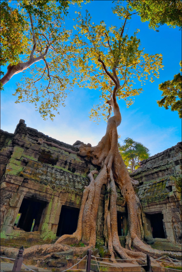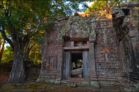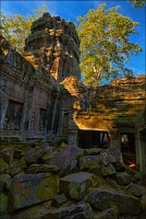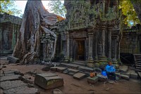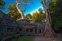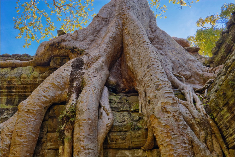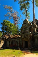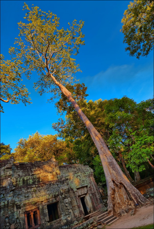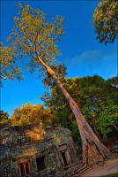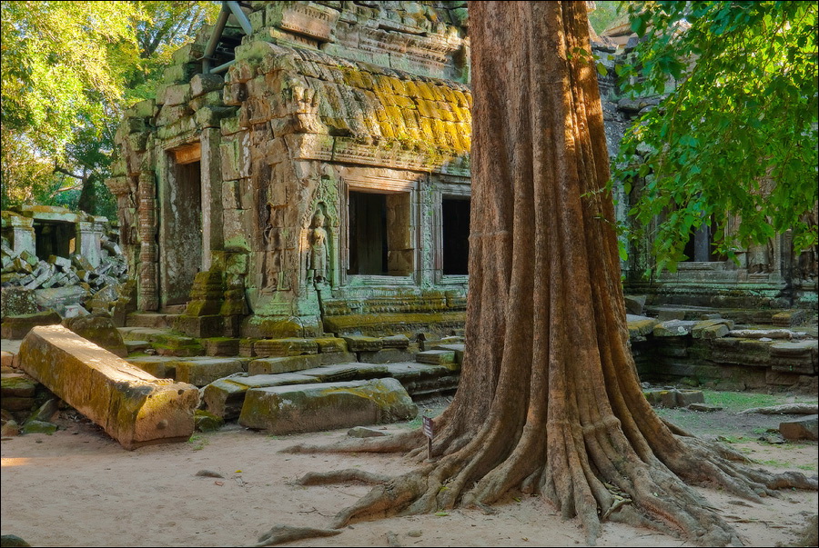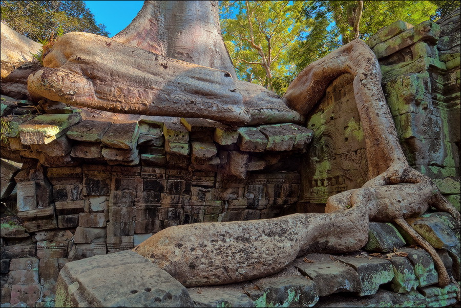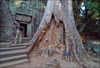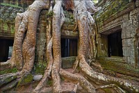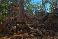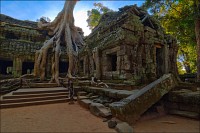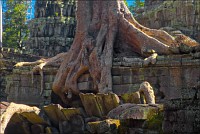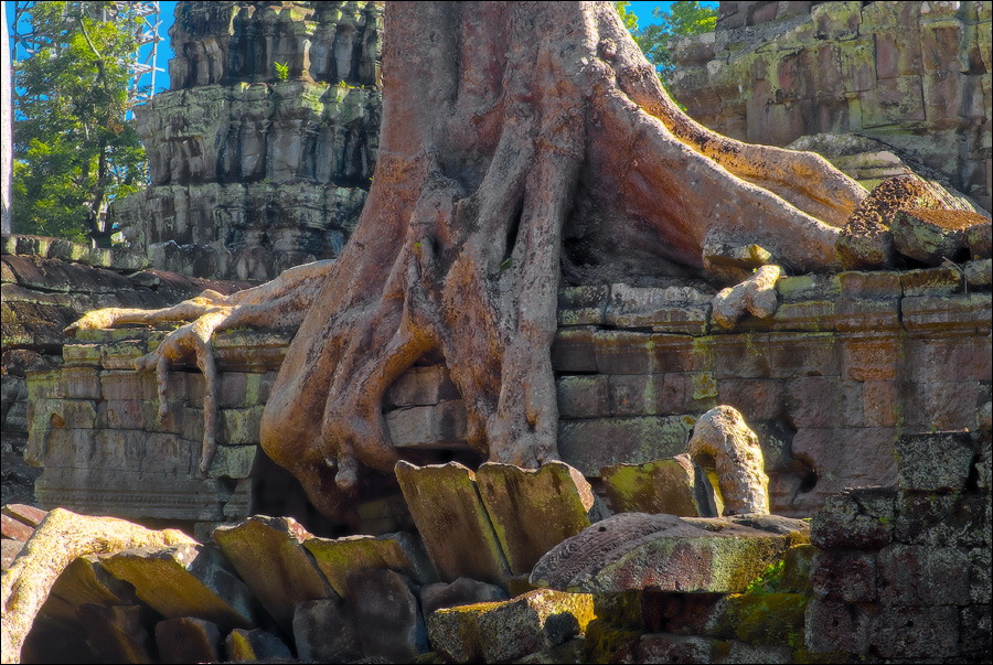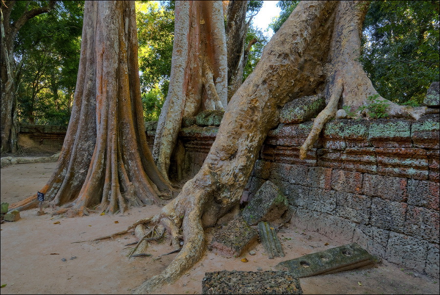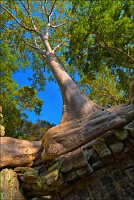 Пытаюсь обойти храм слева, упираюсь в табличку "Danger" и, что хуже, - в груду колючих веток. Без снаряжения - непроход. Центральная гопура на вечной реставрации, ковыряться в лесах и мусоре влом. Что ж, будем вести себя как люди (читать "тупые баранги"). Какой же высоты это дерево? Метров 20-25? Во всяком случае, в 12 мм стекла на кропе оно вписывается исключительно по диагонали (а ведь это 99 градусов!), да и то, если расплющиться спиной по стене. Оставляю фотик на штативе, иду "обниматься" с почти белыми, шелушащимися правильно-овальными чешуйками стволами. Корни, как мускулистые узловатые пальцы, терзают стены, проникают в них, разрывая, как худую марлю, каменные замки на многотонных плитах фундаментов. От этого всесилия, победы живого над мёртвым, у меня по лицу, затылку, спине ползут колючие мурашки. Подарите мне часть вашей дикой, неуёмной мощи! Поневоле начинаешь гордиться, что ты - "живое"… Прильнув всем телом, чувствую, как вместе с этими корнями я становлюсь частью Та Прохма. Это безумно, упоительно приятно.