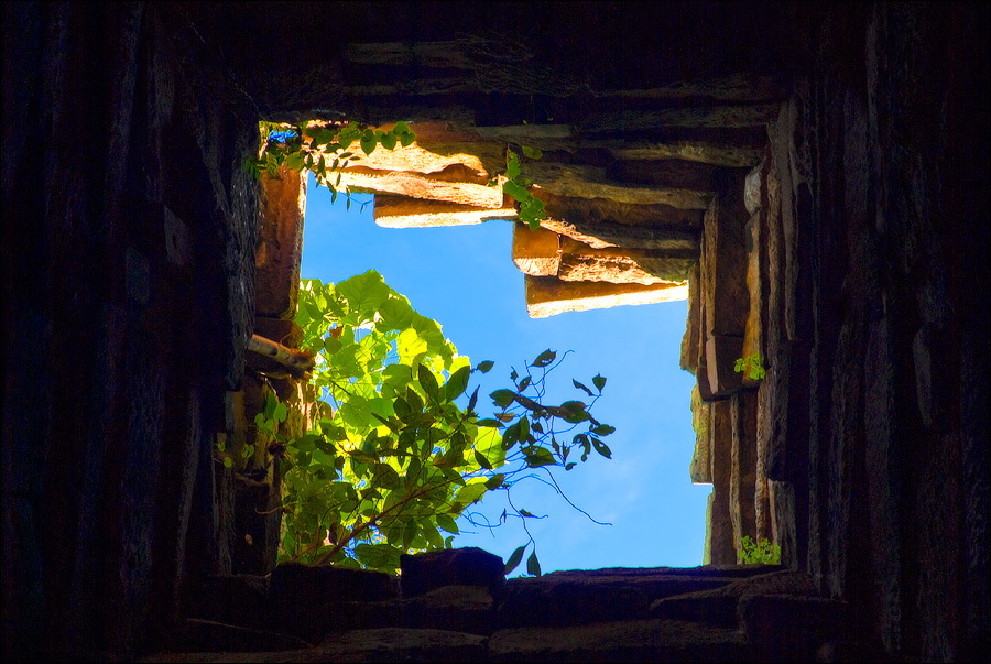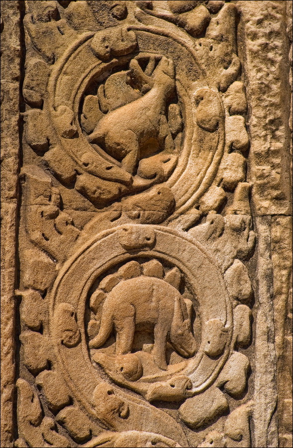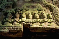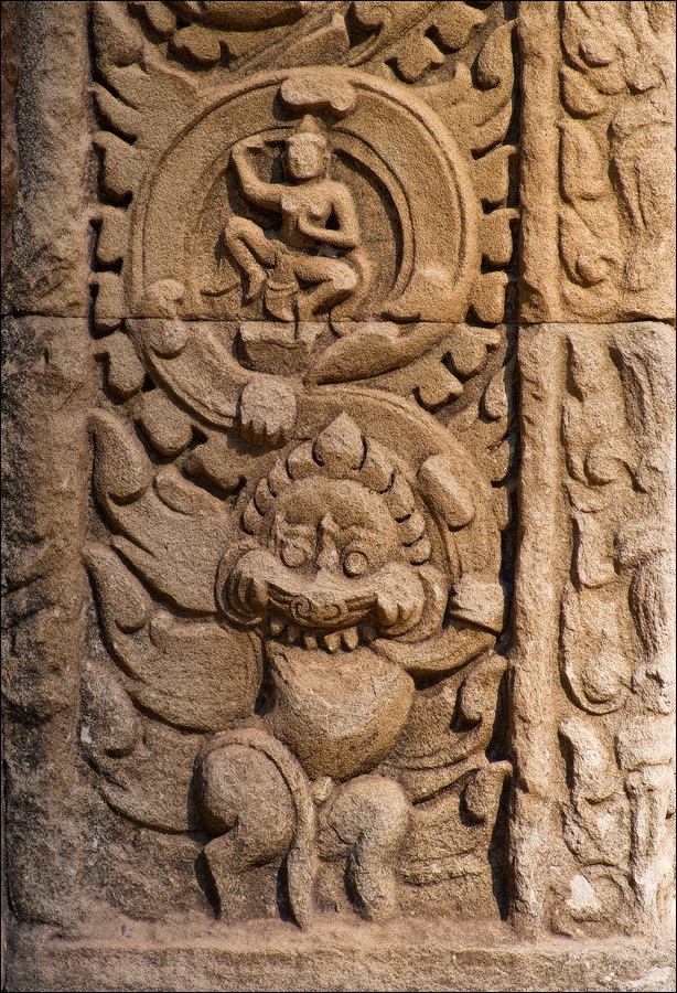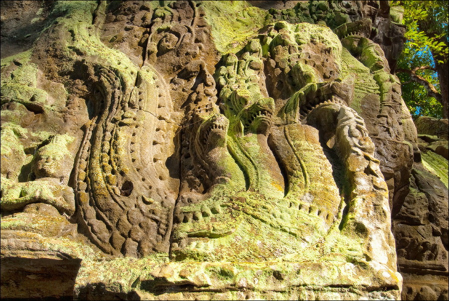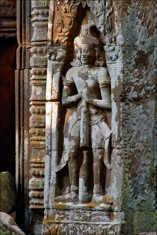 Низкие арки, квадратные колонны, анфилады пустынных комнат, выходящих оконцами на груды зализанных по граням каменюк. Зелёный мох и красно-жёлтый лишайник на барельефе семерых риши. А может, не мудрецы это никакие, а ищущие просветления последователи Гаутамы Сиддхартхи, который должен быть изображён прямо над ними, но то ли украден вместе с добрым куском фронтона, то ли просто уничтожен воинствующими индуистами. Хорошая религия буддизм. Мирная. Наверное, именно поэтому с ней так приятно было воевать... Дворики, башни, раскинувшиеся веером колонны, развалины, щекочущие брюшка облаков деревья. - "Колонны привязывали к слонам и выдёргивали из-под крыш зданий. До восстановления разрушенных храмов у новых правителей никогда не доходили руки", - бубнит прямо за углом "московская студентка". А затем переходит к подробному изложению нелёгкого бытия апсар-наложниц, как они, бедняги, мучались без презервативов, ибо за "неконтролируемую" беременность подвергались изгнанию из чертогов любимого Короля-Бога навсегда…