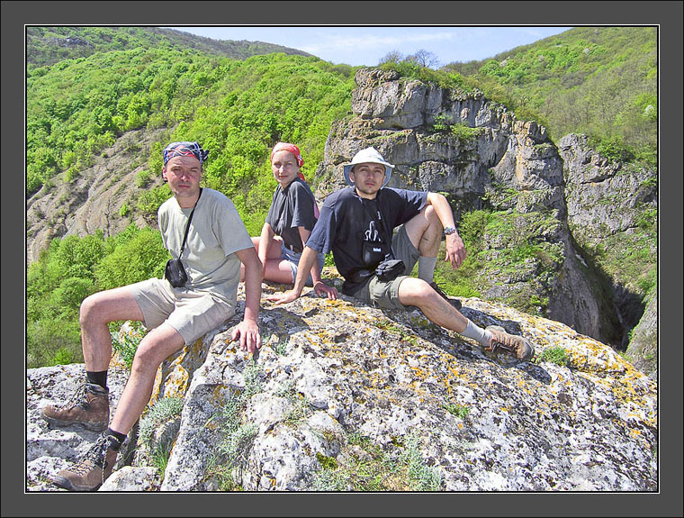 дюже мутна. Смотрю и завидую: Gene после вчерашнего перехода выглядит настоящим туристом. Белая полоса поперёк лба (спасибо бандане). Алый, как у профессионального алканавта, нос. Тронутые загаром веснушчатые щёки. Избежавшие солнечных укусов "куриные лапки" в уголках глаз. Всё, сегодня иду в оранжевой тюбетейке, иначе кто мне, "взбледнувшемуся", поверит, что на майские в Крыму был... 10.59 Высота - 413 метров. Переправляемся через Танасу*. Мощная река. Практически до колен. Проходим ещё одну удобную поляну с кострищем - вот куда наши души мятежные вчера стремились - и начинаем восхождение на северо-восточный рог "короны царя Демира". Подъёмчик спросонок напрягает. Точнее, не сам подъём, а необходимость в его середине сбрасывать едва примостившийся на спине рюкзак. Именно поэтому, а не от какого-либо особенного здоровья, нам с Викой удаётся первыми выскочить к "верхней" смотровой и запечатлеть посиделки "Команды" на нижней. * Как название ни интерпретируй, всё равно от правды никуда не денешься - "тюннос" по-гречески скудный, "тана" по-тюркски телячий (в смысле матёрой корове - не утонуть). Первым нас настигает Паша и, не обращая внимания на "отсюда тоже хорошо видно", сгоняет вниз. Правильно, кстати, делает - если сверху были видны всего три зубчика Демир-Капу, то с длинного узкого тела северо-восточной "воротины" получается осмотреть четыре, а так же добрый кусманчик долины Танасу, протянувшейся почти вдоль меридиана - с юга на север.